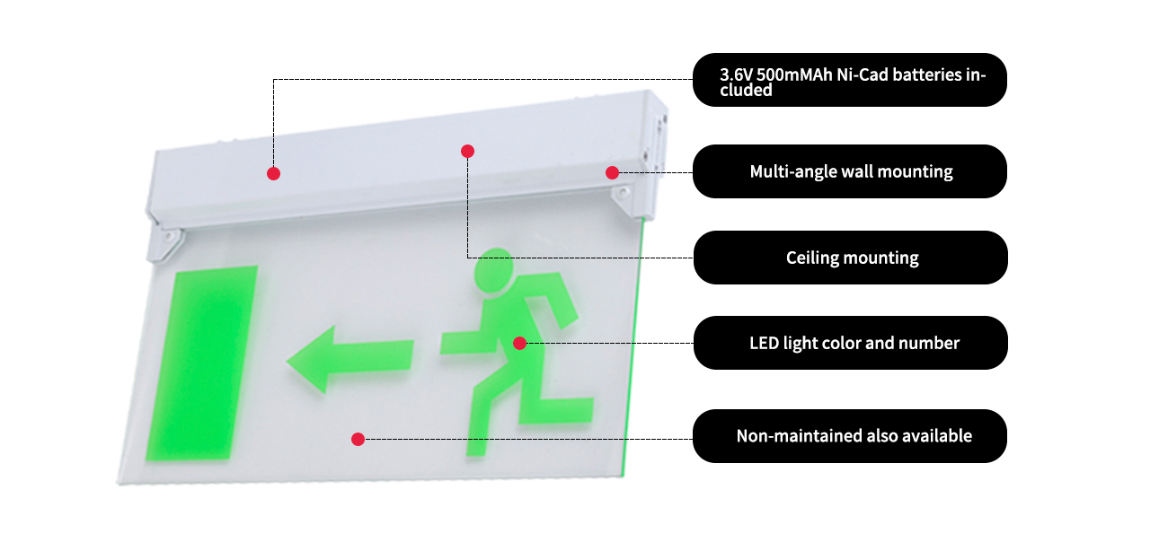 *Sao lưu pin điện khẩn cấp-Dấu hiệu thoát LED được thiết kế với pin NI-CAD 3,6V 500mAh miễn phí cung cấp thời gian khẩn cấp tối thiểu là 6 giờ. Thời gian sạc lại của pin là 24 giờ.
